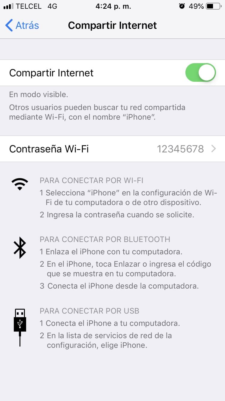 2. En el celular que va a usarse para compartir el internet y controlar el GPS debera activar esa opcion. En especial en el iPhone se activa entrando a [Configuracion] luego a [Compartir Internet] y debera prender la opcion [Compartir Internet], tenga en cuenta la Contraseña WiFi, la va a necesitar mas adelante. Ponga a un lado este celular, por el momento no se va a ocupar.