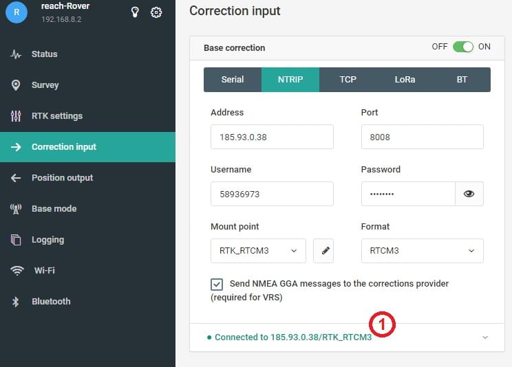 7. Ya puede poner a un lado el segundo iPhone, regrese al primer iPhone (el que esta compartiendo el internet) y entre a la aplicacion ReachView, seleccione de la lista el GPS Reach y entre a la opcion de “-> Correction input”. Seleccione [NTRIP] e introduzca los datos que se muestran en la tarjeta TopNET, al terminar de capturar los datos note que debe decir “Connected to 185.93.0.38/RTK_RTCM3” como se muestra en la imagen (1)