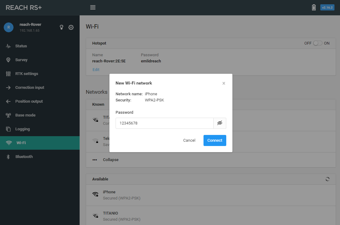 6. Dentro de la pantalla del GPS Emlid seleccione la opcion WiFi, selecciona la red que genero su primer celular, si esta usando un iPhone la red tiene por nombre iPhone, capture la contraseña y oprima [Connect]. En este momento el GPS Emlid debera conectarse al internet compartido de su celular, en especial en el iPhone se distingue por la banda de color azul que aparece en la pantalla que indica que el Emlid se ha conectado y se esta compartiendo el internet.