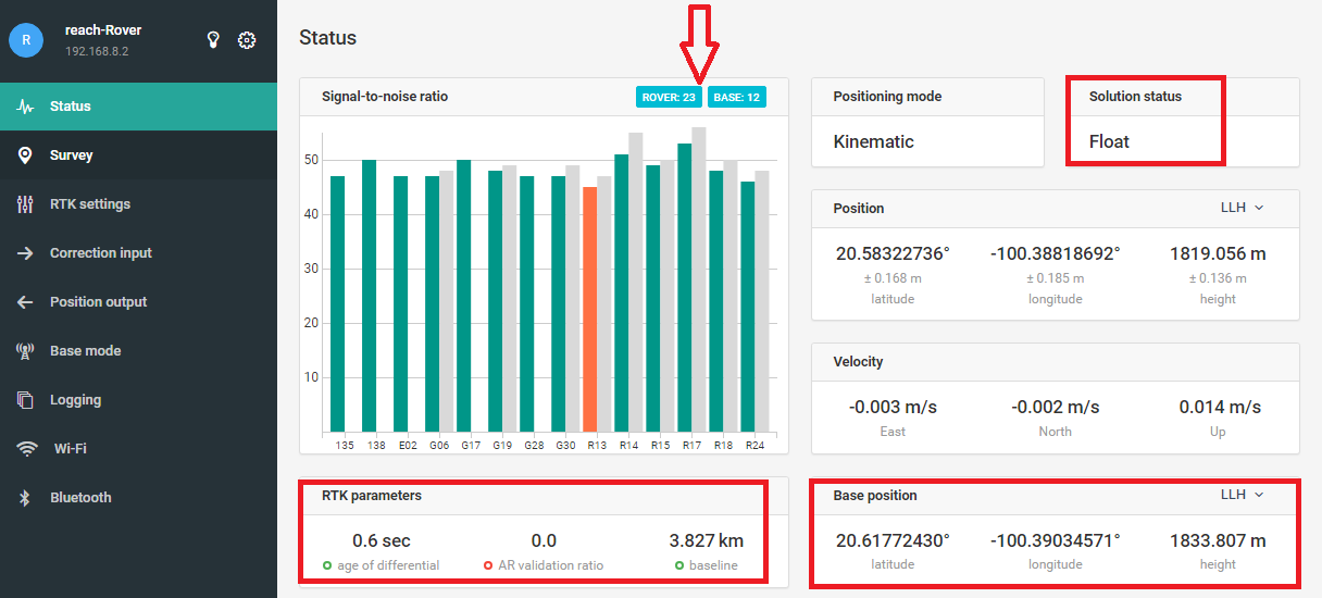 - La leyenda “Rover:nn” y “Base:mm” que indican cuantos satelites esta recibiendo el Rover y cuantos la Base